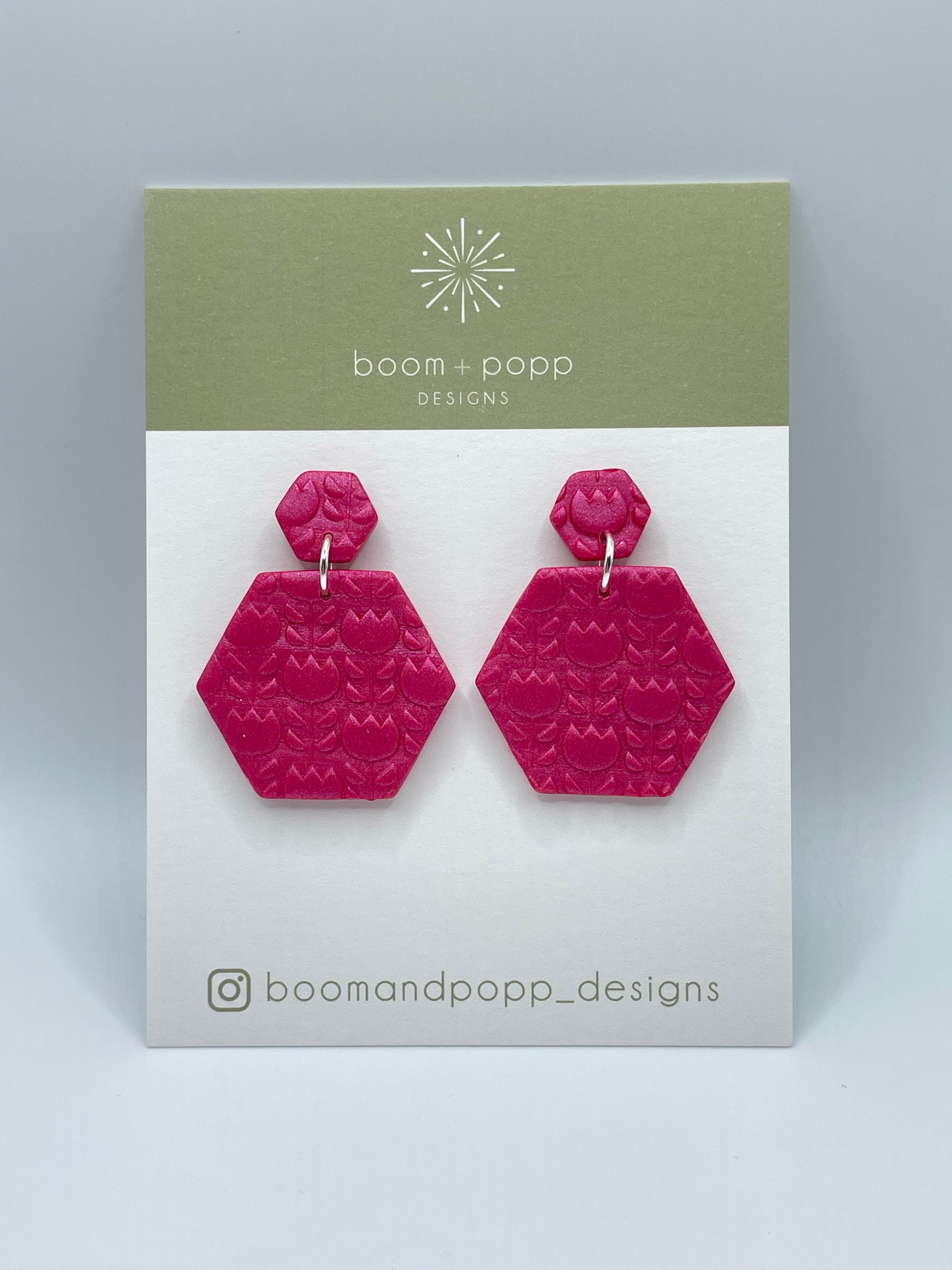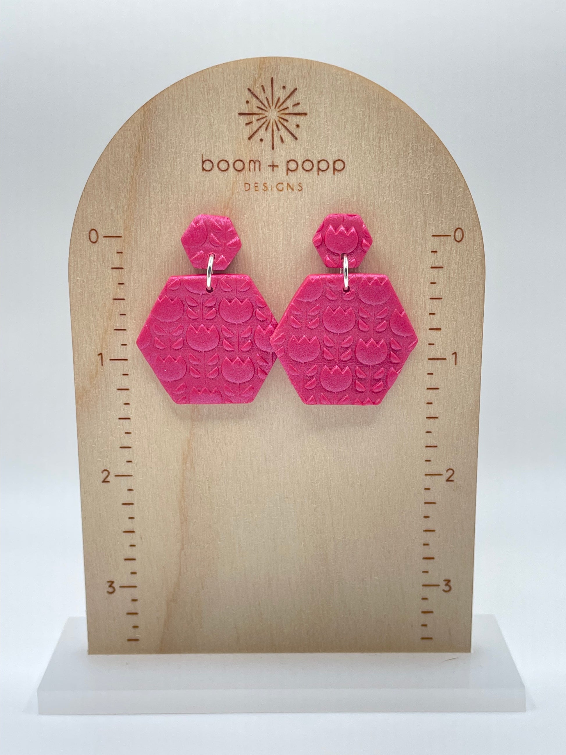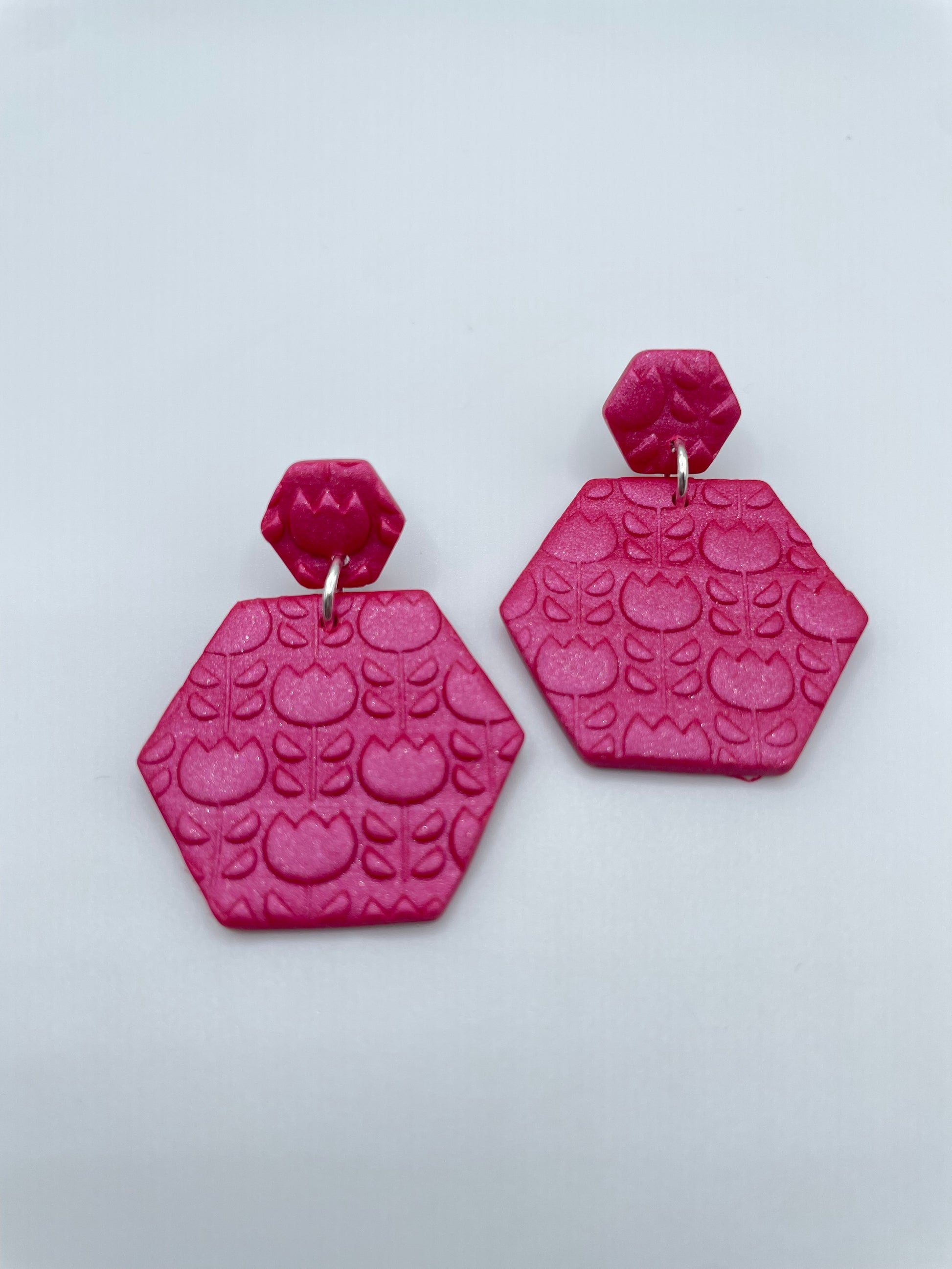 The Alex earrings feature a hexagon shape base and stud attachment with a bright, shimmery pink hue and an elegant Scandinavian-inspired floral texture. Lightweight and effortlessly stylish, they bring a touch of delicate beauty to any outfit. Perfect for those who love timeless, nature-inspired designs with a hint of sparkle!